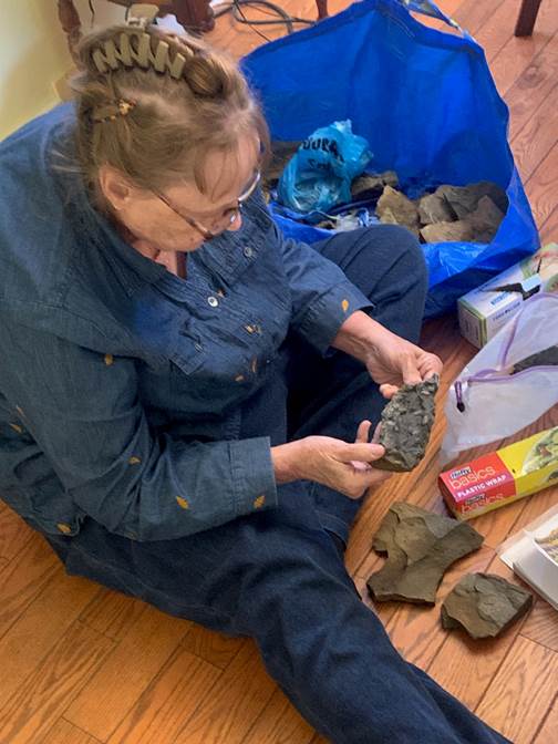 Yeager House Carol sorting through blocks of hollow-sounding shale to bring home to open with Zoe.
