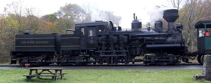 Cass Scenic Railroad One of their three(!) Shay locomotives. The next day Ron and Carol took the train from Cass (2452-feet) to Bald Knob (4842-feet), total distance of 22 miles.