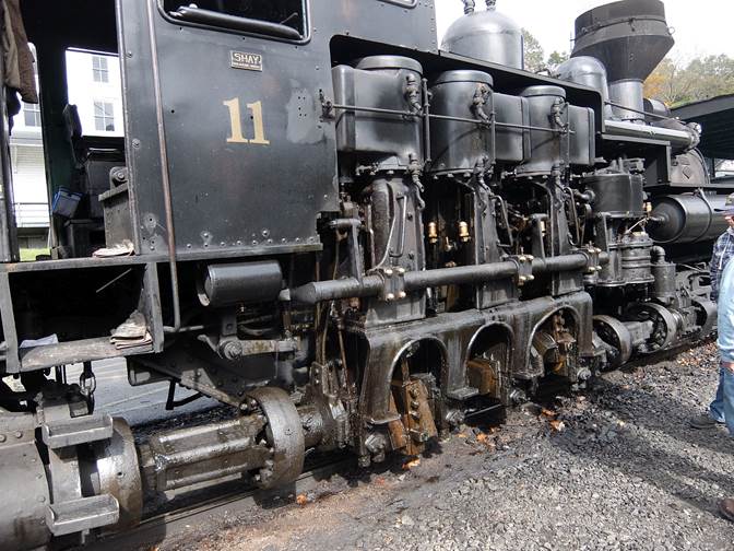 Shay Locomotive closeup - The Shay has 3 vertical cylinders that drives all 12 wheels (4-4-4 configuration) through a complicated array of gears, universal joints and sliding shafts.