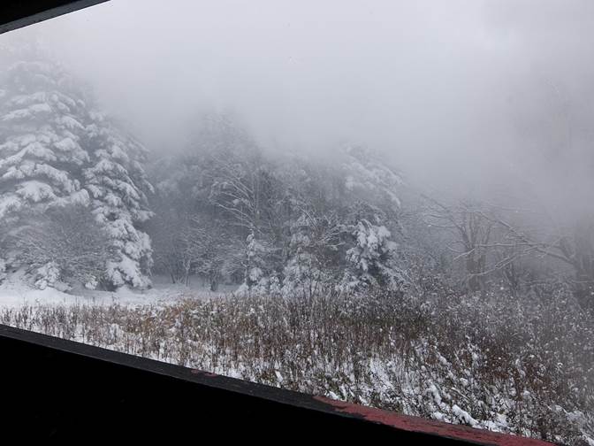 Bald Knob Not much to see. A white cow eating a snow ball in the fog.