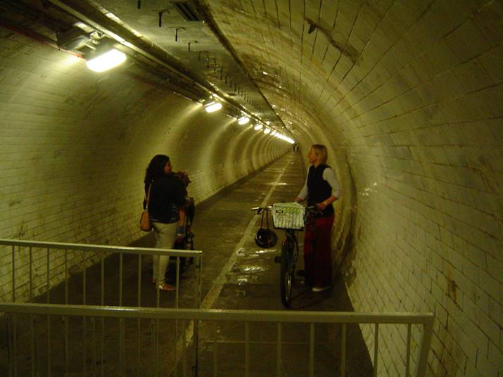Greenwich, under the Thames. Ladies chatting in the Greenwich Foot Tunnel that goes from Greenwich to the Isle of Dogs. Opened in 1902, 1,215 feet (370.2 m) long.