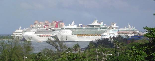 Nassau There were 5, yes five, cruise ships in Nassau harbor that Wednesday. Ron expected crowds everywhere, but that did not prove to be the case since they decided to avoid the casinos and Vegas-type hotels. The Glory arrived right at lunch time.
