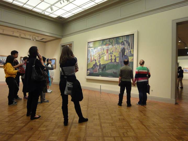 Institute of Art. People looking at Georges Seurat’s ‘A Sunday on La Grande Jatte.’ Late 19th c. Recall Ron and Carol saw a topiary of this in Columbus, Ohio: https://www.facebook.com/photo.php?fbid=4708461409400&l=61e7d29670